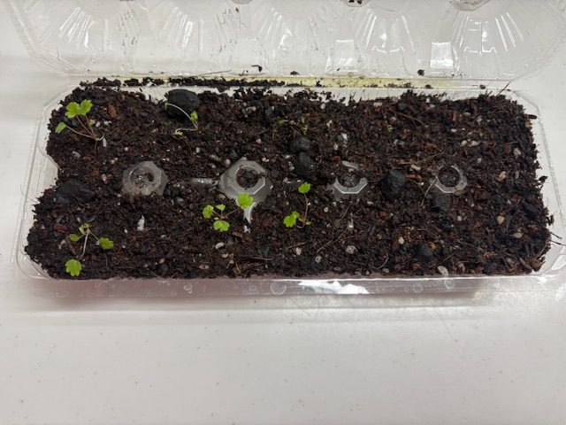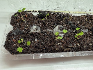 ゆっくりですが少し成長しました!同じ時期から栽培スタートした、LED水耕栽培のいちごの苗との成長のスピードの差は大きすぎますが・・・たまごのプラスチックの中のいちごたちも頑張っています。あんなに小さな粒の種がちゃんと成長してくれて、感激です。
