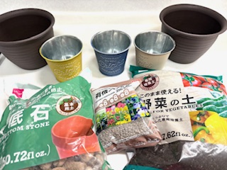 自宅に持ち帰って、いよいよ植木鉢に移し替える為、鉢や土、肥料を100均で買って来ました!かわいい鉢もありました♡