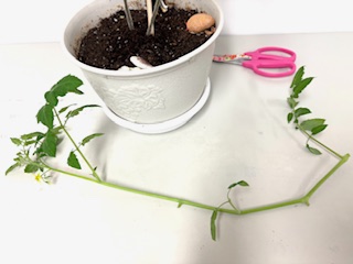 こちらの鉢のトマトも大きくなりすぎて傾いているので、折れる前に少し短く切ることにしました。